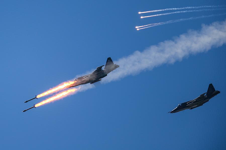 The pilots will perform tasks using the Su-25SM attack aircraft, Su-30SM jet fighters, Su-34 jet bombers, Ka-52 Alligator and Mi-35 assault helicopters, as well as Mi-8AMTSh Terminator combat transport helicopters.