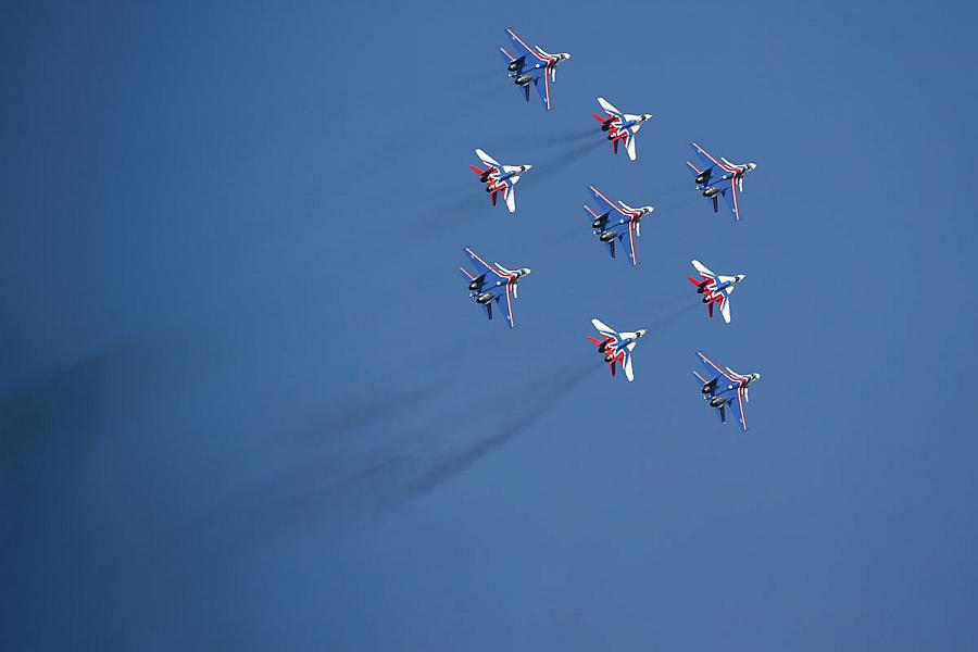 The main event of the celebration turned out to be the two-hour program of flights of four Russian aviation groups, the Berkuts, the Strizhi, the Russian Knights and the Sokols of Russia, as well as performances by the First Flight group.