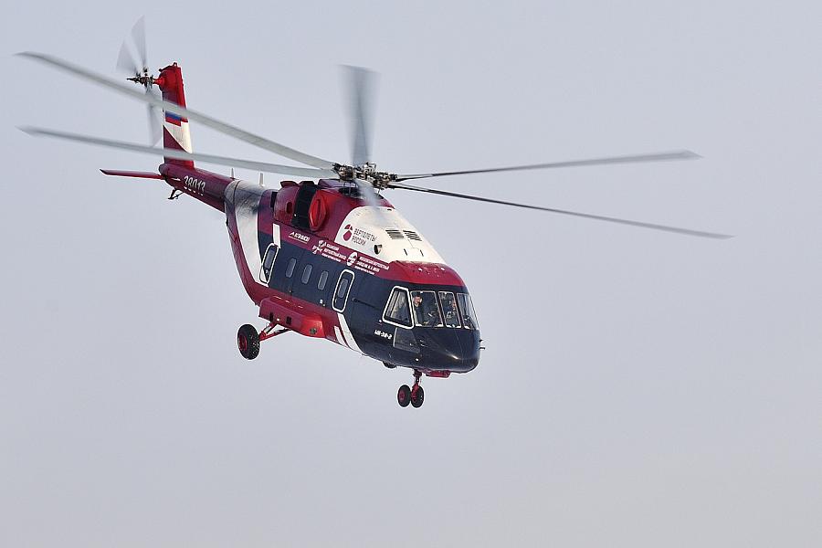 The Mi-38 is equipped with new domestic high-performance TV7-117V engines, an integrated digital flight-navigation system with data display on five LCD displays, and an explosion-proof protected fuel system. Also, the helicopter was equipped with additional supports on the landing gear for landing on soft ground and snow. The installed integrated on-board equipment complex IBKO-38 provides the crew with high-quality information that ensures a high level of flight safety. In the cabin of the helicopter are easily removable seats, removable sanitary equipment and roller table equipment for loading, unloading and transporting cargo.